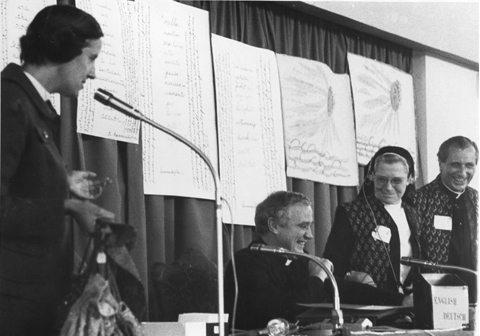 SSND leadership and the development of themes have been influenced by international meetings with other religious. Mother Georgianne Segner, SSND, is shown at a meeting of the Union of International Superior Generals in Rome.